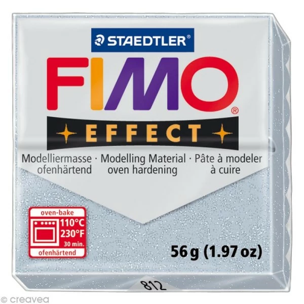 La pâte Fimo Effect Argent pailletÊ 812 est une pâte à modeler qui durcit en la passant au four. AgrÊable à travailler car très mallÊable, elle permet aux petits comme aux grands de rÊaliser diverses crÊations.