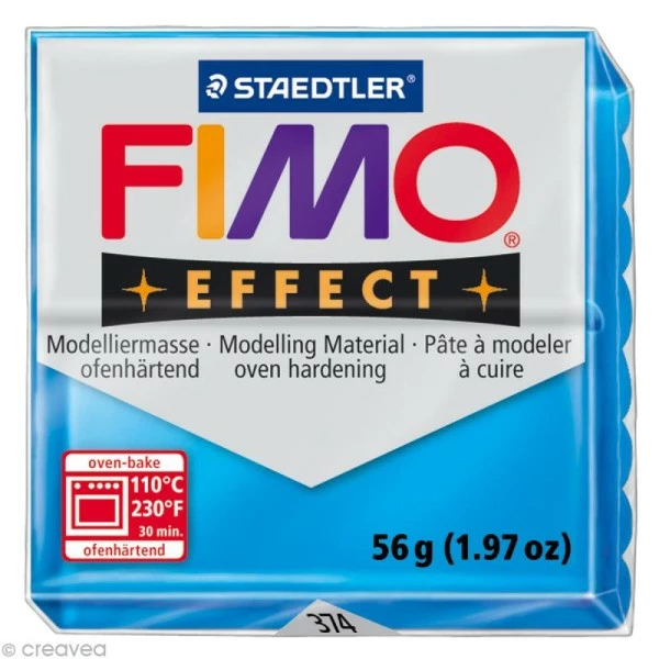 La pâte Fimo Effect Bleu Translucide 374 est une pâte à modeler qui durcit en la passant au four. AgrÊable à travailler car très mallÊable, elle permet aux petits comme aux grands de rÊaliser diverses crÊations.