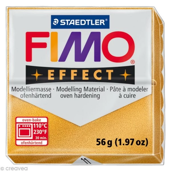 La pâte Fimo Effect Or 11 est une pâte à modeler qui durcit en la passant au four. AgrÊable à travailler car très mallÊable, elle permet aux petits comme aux grands de rÊaliser diverses crÊations.