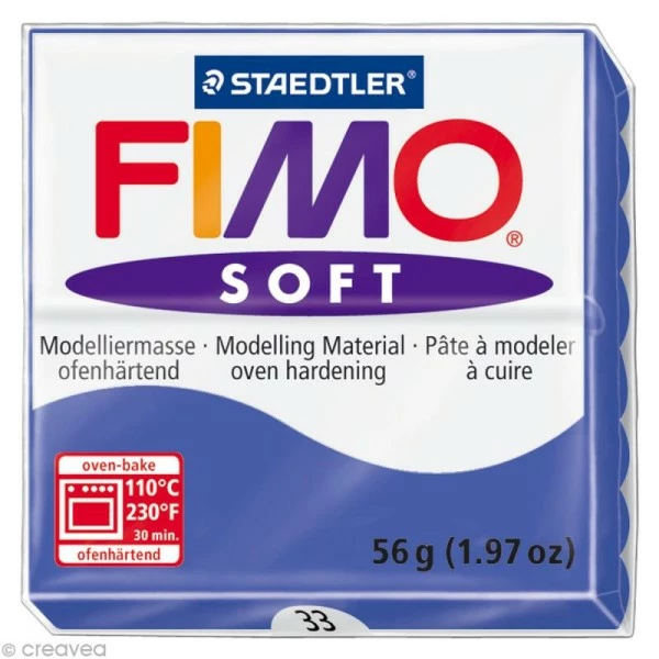La pâte Fimo soft Bleu Brillant 33 est une pâte à modeler qui durcit en la passant au four. Agréable à travailler car très malléable, elle permet aux petits comme aux grands de réaliser diverses créations.