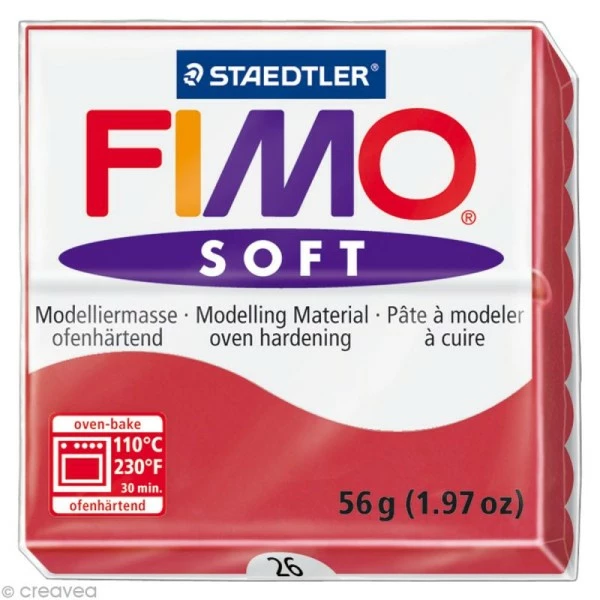 La pâte Fimo soft Rouge Cerise 26 est une pâte à modeler qui durcit en la passant au four. Agréable à travailler car très malléable, elle permet aux petits comme aux grands de réaliser diverses créations.