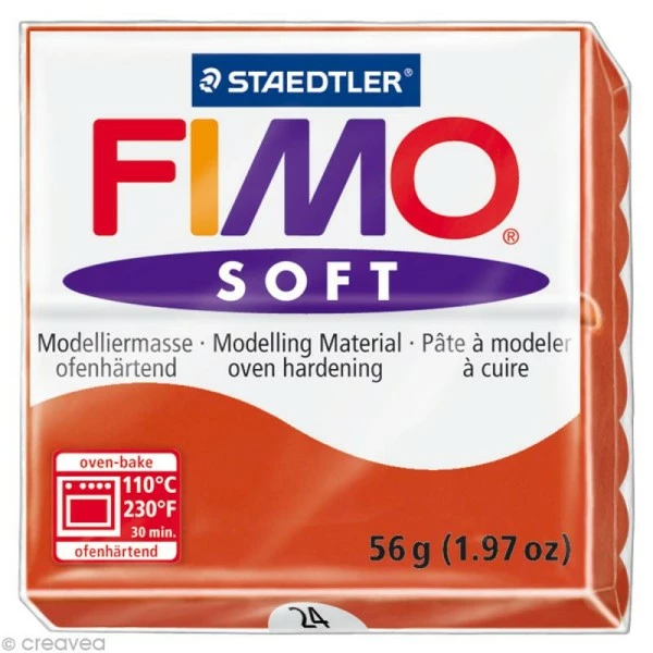La pâte Fimo soft Rouge Indien 24 est une pâte à modeler qui durcit en la passant au four. AgrÊable à travailler car très mallÊable, elle permet aux petits comme aux grands de rÊaliser diverses crÊations.